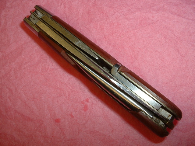 Il s'agit d'un vieux Wenger Tahara Swiss Army Knife probablement à partir des années 1940 milieu puisqu'il a le tournevis de style plus âgé. Elle a le timbre de tang avant « Wenger Tahara » et un « P » sur la face arrière, indiquant que c'était un couteau privé acheté. Ces couteaux ait un type de « fibre » d'échelle, et celui-ci est marqué avec la marque « WK » ou « WaffenKontrol » sur l'échelle de l'avant.