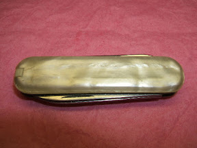 This cracked ice scale Victorinox classic is an older Victoria tang stamped version. It has the old metal tipped tweezers along with an advertisement metal inlay in the front scale.